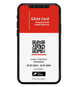 Die „Eintrittskarte“ zu allen bewegten und genussvollen Bergerlebnissen ist die Gäste-Card Bregenzerwald & Großes Walsertal. Sie bringt Besucher*innen beliebig oft per Bergbahn nach oben, gilt für umweltfreundliche Fahrten mit den öffentlichen Bussen und zudem für erfrischend-entspannende Stunden in den Freibädern. Die Gäste-Card Bregenzerwald & Großes Walsertal erhalten alle Gäste kostenfrei, die zwischen 1. Mai und 31. Oktober 2024 drei oder mehr Nächte bei uns verbringen. Sie gilt vom Anreise- bis zum Abreisetag.